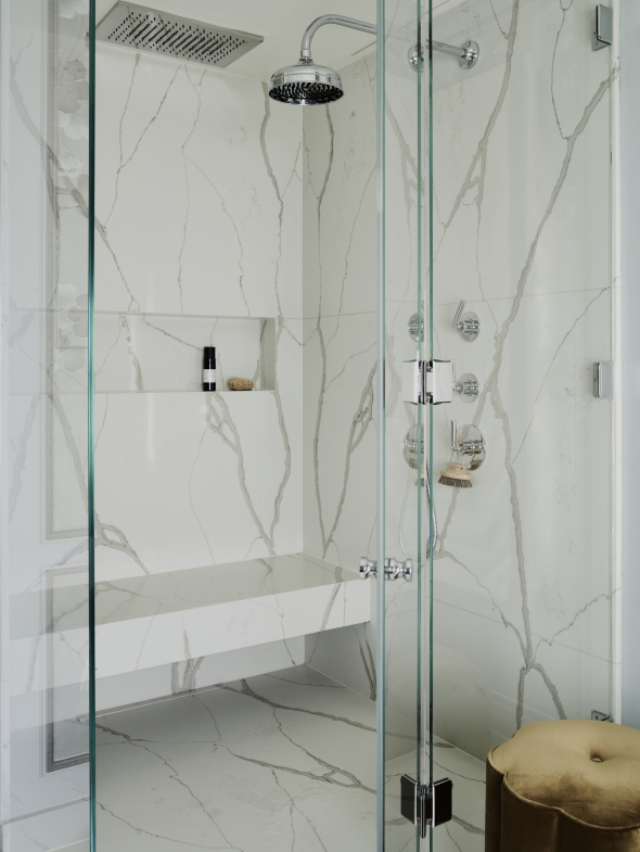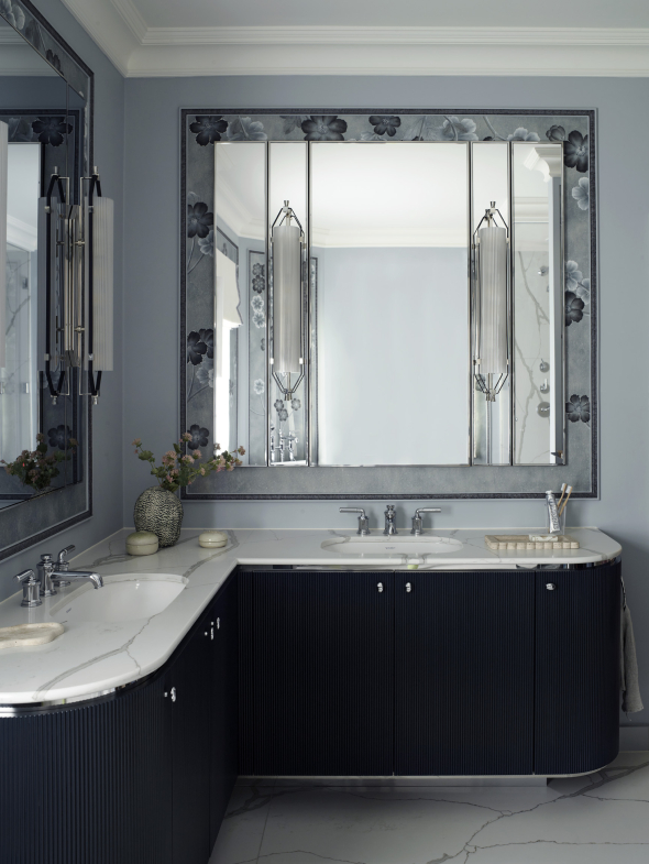 A bespoke vanity with fluted cabinetry and a marble surface curves gently into the corner, softening the geometry of the space. Chrome fittings and mirrored panels introduce a touch of Art Deco refinement, while the painted woodwork frames the scheme much like a mount around a painting. It is a reminder that restraint can be as powerful as embellishment.