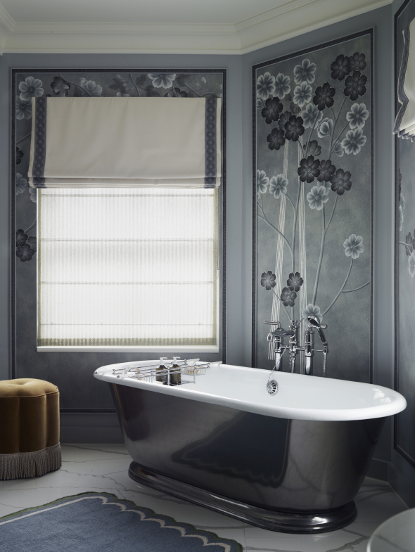 Nowhere is this dialogue between past and present more apparent than in the principal bathroom. Framed by hand-painted de Gournay wallpaper – a sweep of inky florals set against a soft, atmospheric ground – the room feels both romantic and composed. At its centre rests Drummonds’ Tamar freestanding bath in polished cast iron, its generous silhouette offering sculptural clarity against the intricacy of the walls. The polished exterior, hand-finished to an almost mirror-like sheen, reflects light softly across the floor, while taps from the Bestwood collection introduce a confident architectural note – precise in proportion, reassuring in weight.