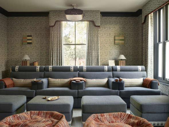 Elsewhere, intimacy is found not through scale but through texture. The cinema room is wrapped entirely in block-printed fabric by Fermoie – deployed across walls, curtains, and a fringe-trimmed pelmet to enhance acoustics and deepen the palette. A bespoke sofa, designed to seat four with integrated side tables, anchors the space, while circulation was consciously reduced to prioritise comfort.