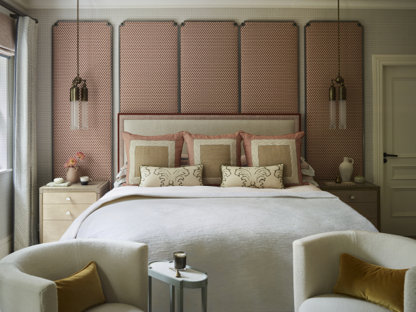 “Our goal was to create something that felt like a real home away from home,” the studio notes. That instinct carries through to the guest bedrooms, where angled ceilings are cocooned in a single Lewis & Wood wallpaper, dissolving awkward junctions and enveloping the architecture in pattern.