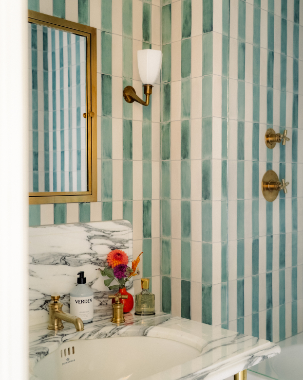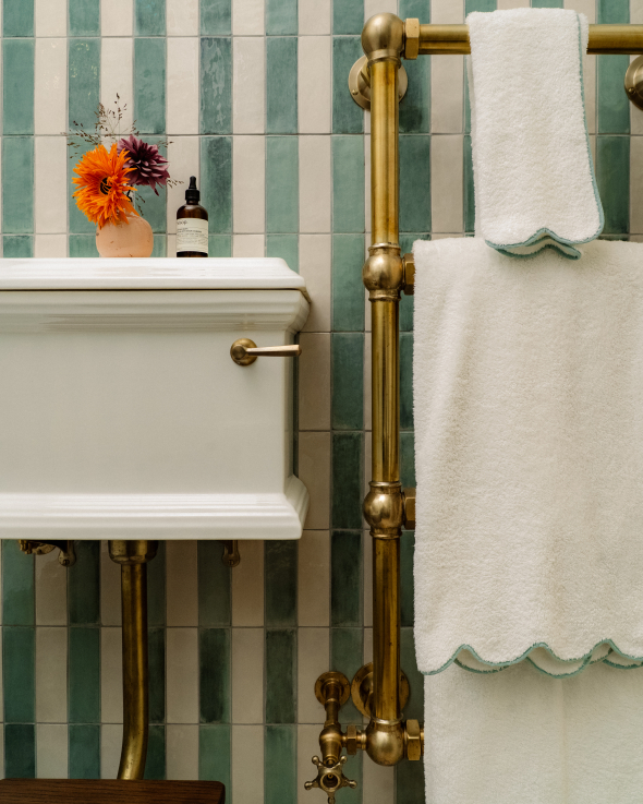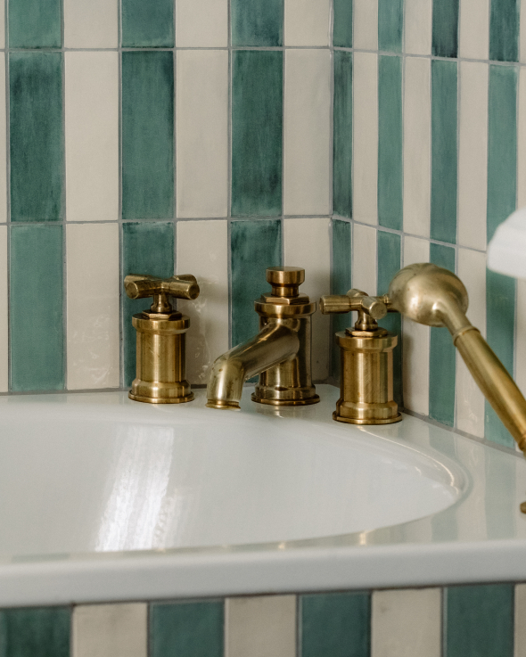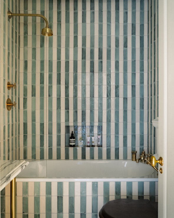 The guest bathroom adopts a subtly different tone. As it also functions as a guest loo, it offered an opportunity for play. Green and cream striped tiled walls introduce rhythm and personality, while sanitaryware from Drummonds’ Bestwood collection brings a cleaner, slightly more contemporary edge. To accommodate a second Crake vanity – so admired by the client in the principal bathroom that it became non-negotiable – a sliver of space was borrowed from the adjacent bedroom. Structurally complex, the adjustment proved transformative, allowing the same lightness of form to be carried through both rooms.
