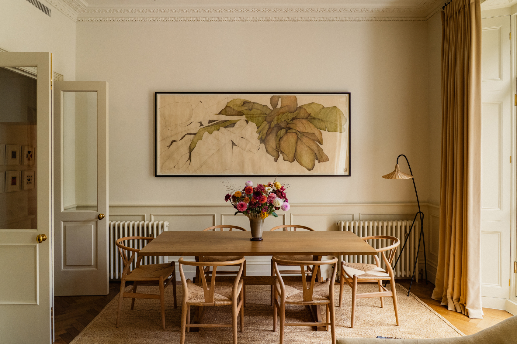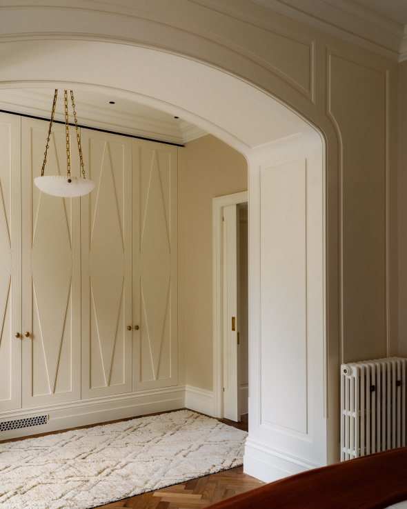 Walls were opened up, ceilings raised where possible, and discreet storage carefully integrated throughout. Parquet flooring now runs across the principal rooms, its formal geometry softened by layered rugs, while artwork curated with Rebecca Gordon lends depth and personality. The atmosphere is airy yet grounded – modern in its flow, but enriched with texture and warmth.
