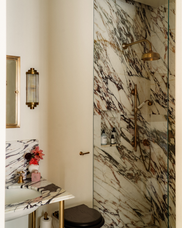 To maintain a sense of lightness, Jones selected a Drummonds Crake vanity in place of a heavier, cupboard-laden piece. Raised on slender legs, it avoids visual weight at floor level, allowing light to circulate freely. Brushed brass fittings bring a gentle warmth to the marble’s cool surface. “I’ve always felt that brass introduces an elegant warmth to a bathroom,” she explains. “The clients had never used brass in their other homes, so I encouraged them to try something new – and what better place to do that than their city-based pied à terre.”
