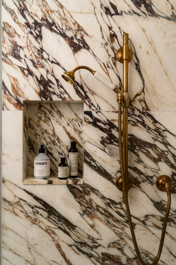 The bathrooms, however, mark the most significant transformation. Previously run down and awkwardly arranged, they were dominated by bulky layouts that consumed precious space. In the master bathroom, a dated bath-shower combination was removed to create a walk-in shower clad in Calacatta Viola marble. Its bold veining introduces drama without heaviness, lending the room a refined composure.