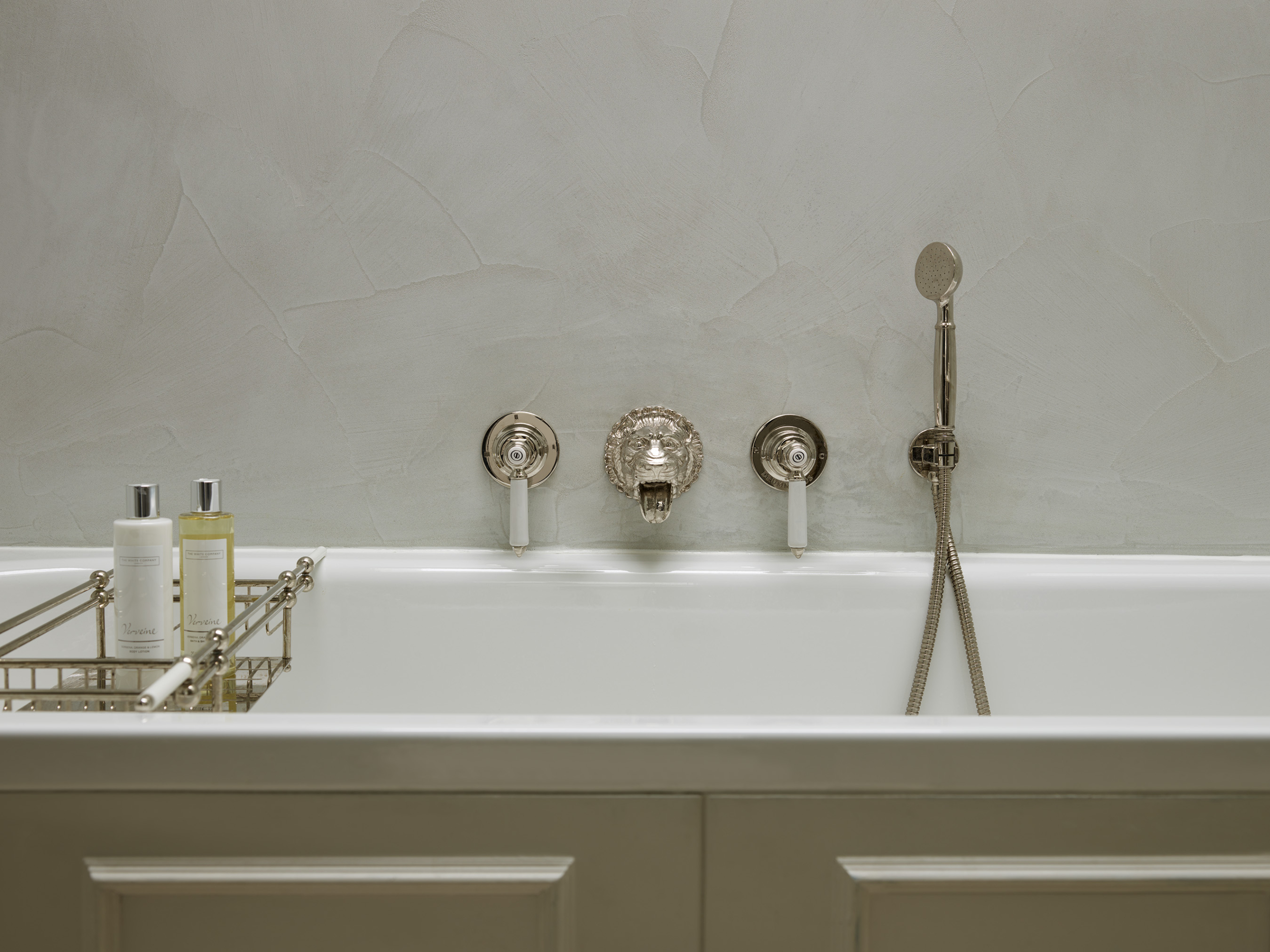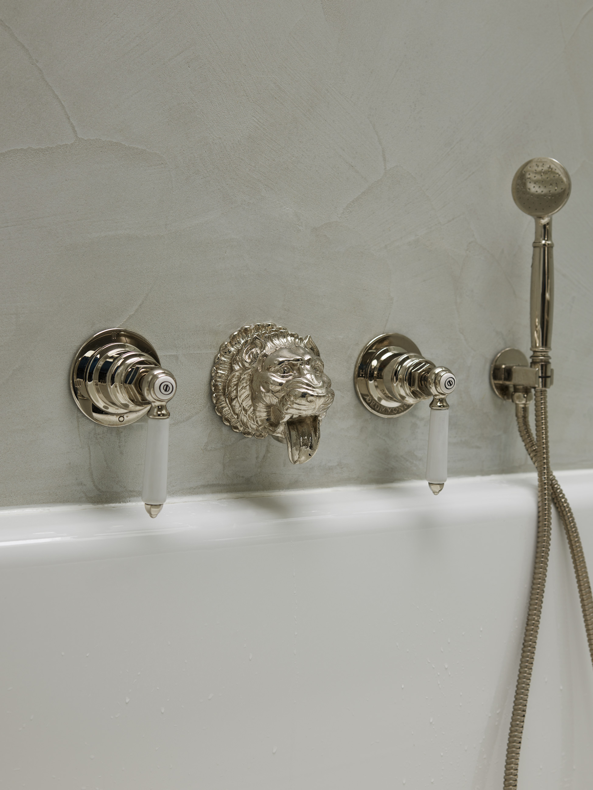 Our Lion’s Head is a unique original piece, created from an early 1920s vintage design to give a grand, theatrical air to your bathroom. Each head is hand carved in wax before being cast, allowing for the finest, most intricate details to be captured exactly as intended by our skilled craftspeople. Available with the lion’s head on its own or with taps and a backplate. Choose Mull heads or Chessleton lever handles to complement the style of your bathroom.
