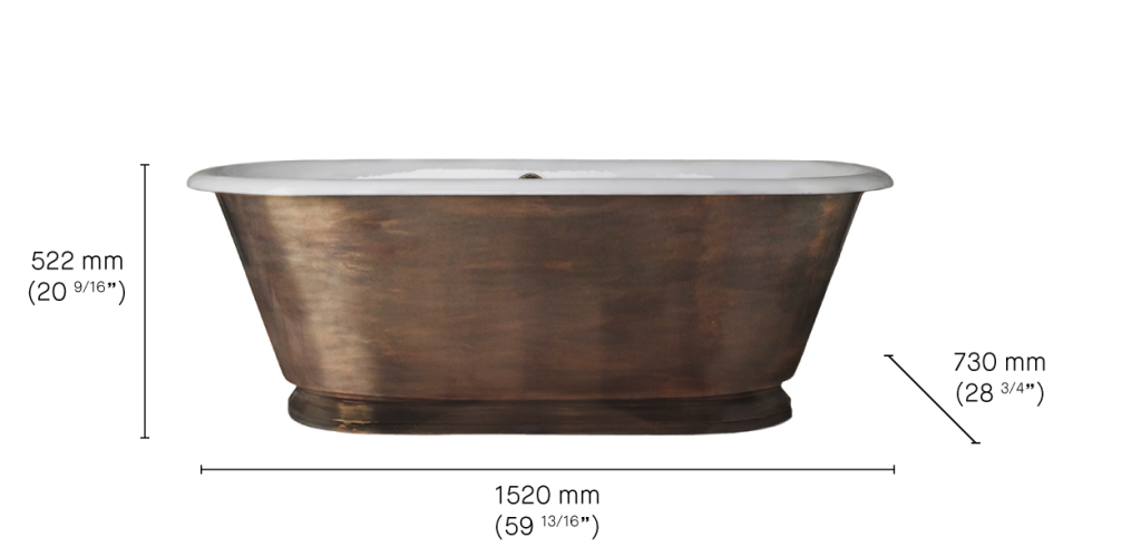 The Burnished Copper Tweed Cast Iron Skirted Bath Tub is the smallest brass-clad bath in Drummonds’ collection. Cast in solid iron and enamelled by hand, it is finished with a burnished copper exterior and gentle tonal variation that lends warmth and depth while retaining the strength and durability of cast iron.