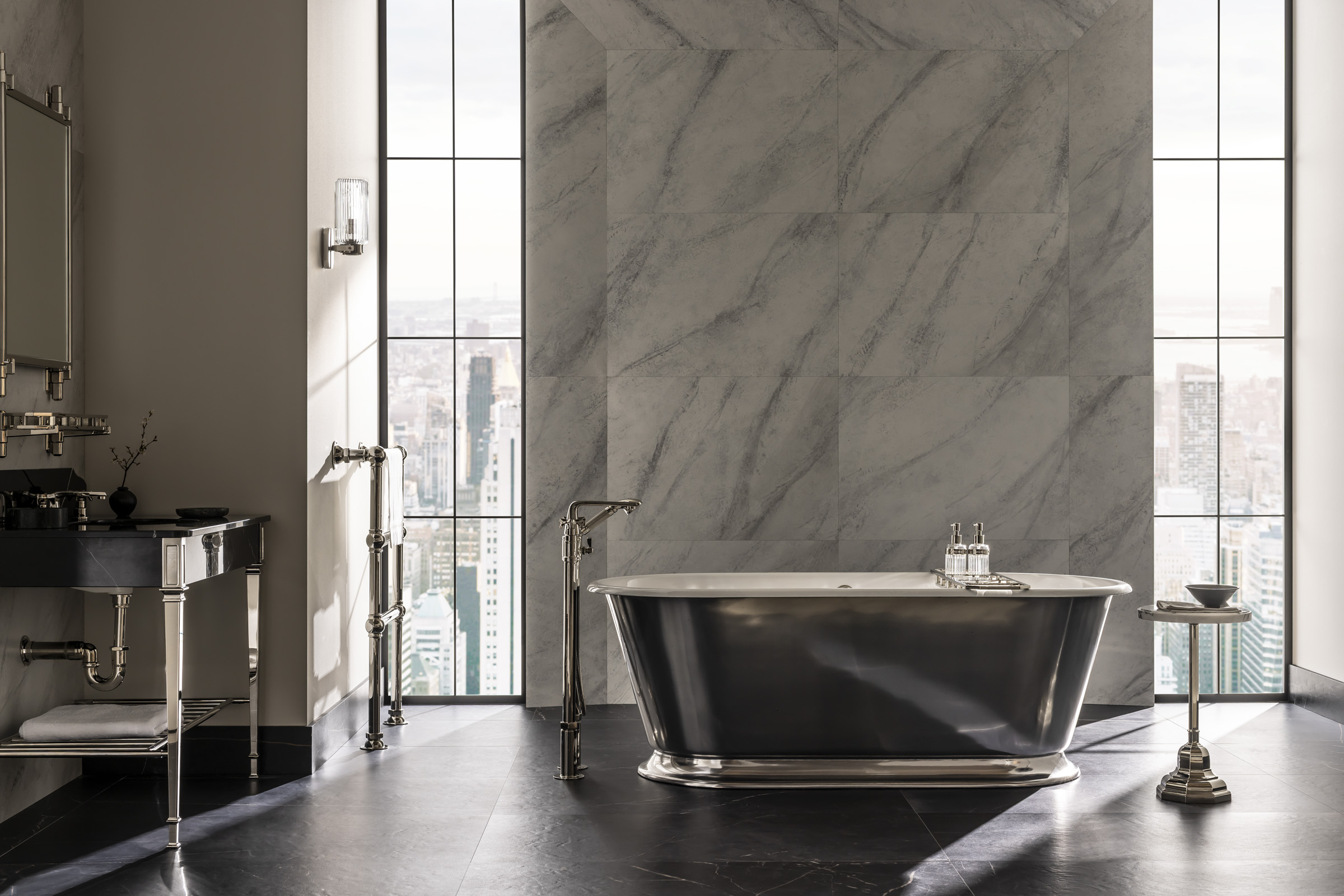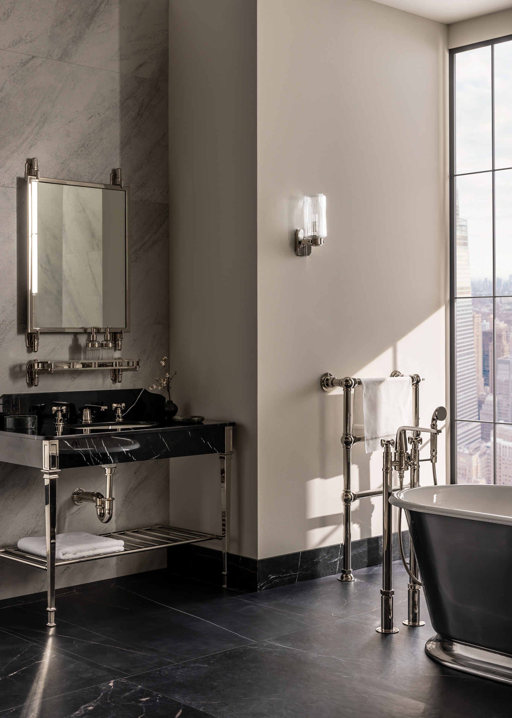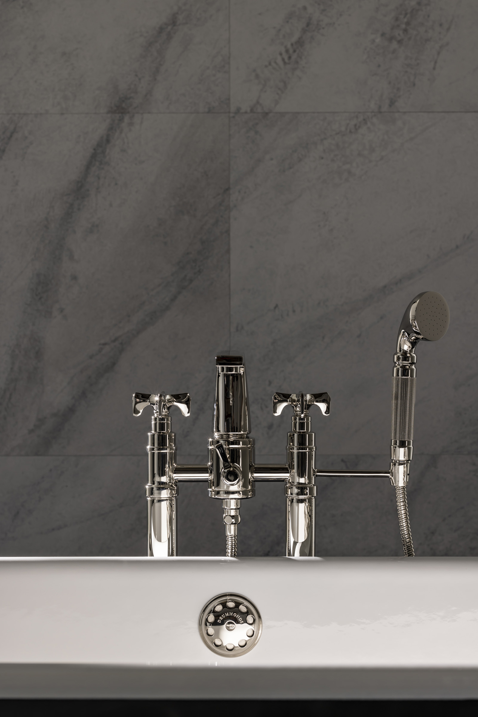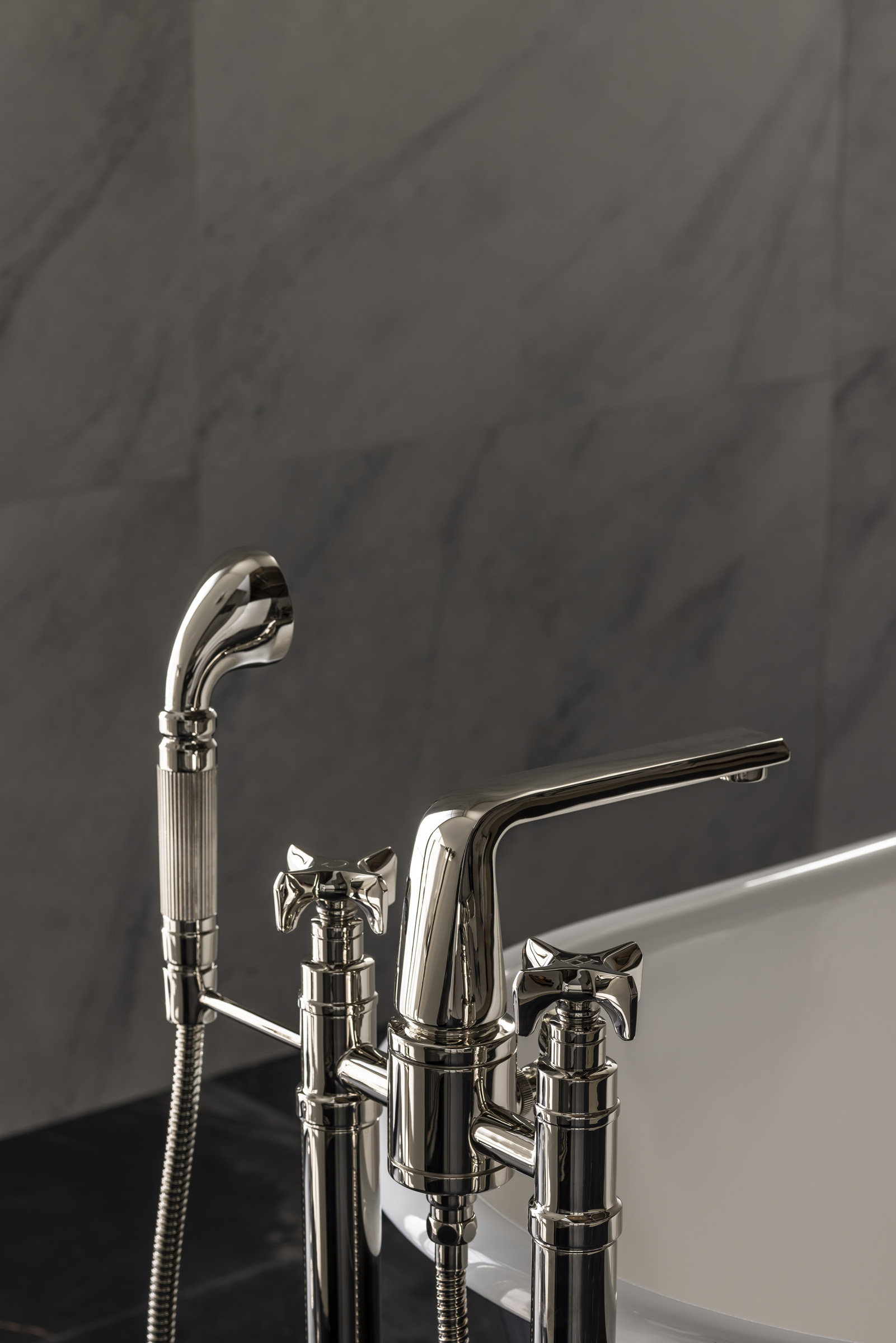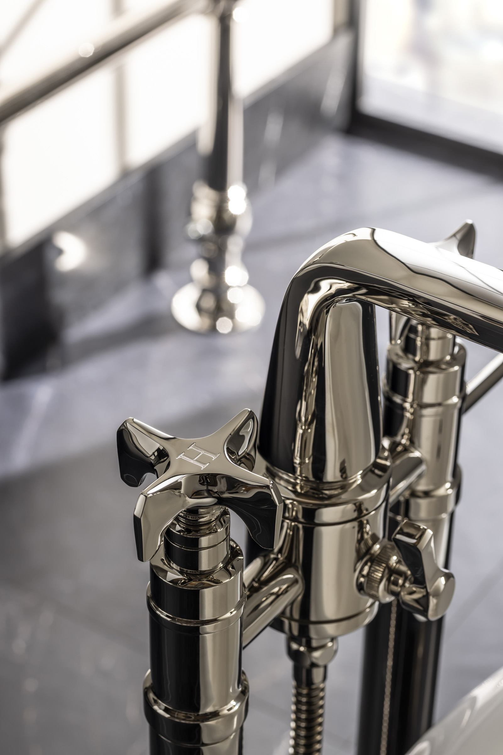 Part of the Hudson Collection, the X-Head Floor Standing Bath & Shower Mixer was developed with Pembrooke & Ives. It features bold cross-head handles and a floor-standing design with a height-adjustable stand for installation flexibility.